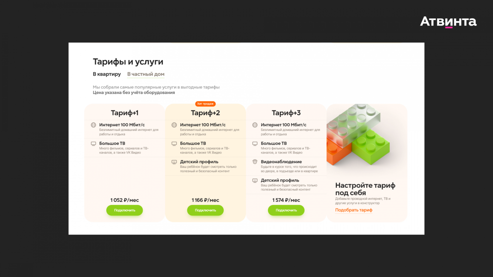 Мы реализовали интерфейс так, чтобы клиенту было удобно изучать цены. Карточки готовых тарифов структурированы и оформлены от меньшего к большему, что визуально помогает оценить наполнение пакета.
