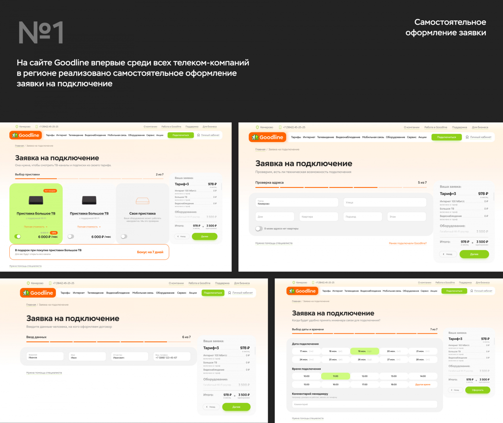 Одна из главных функций — самостоятельное оформление заявки на подключение. Это новое решение для всего телеком-рынка в регионе — Goodline первым внедрил такую возможность на своем сайте. Обновление убирает лишние касания с менеджерами и помогает быстрее получить услугу.
