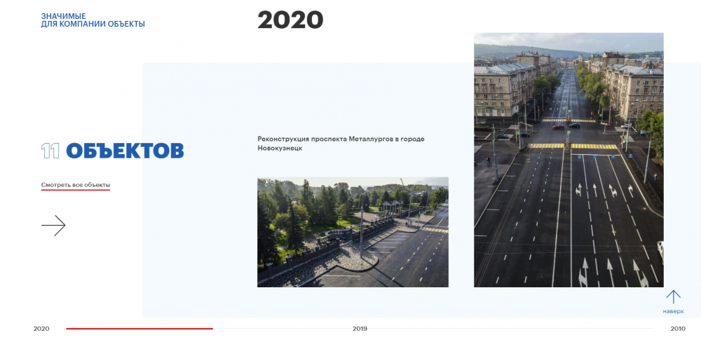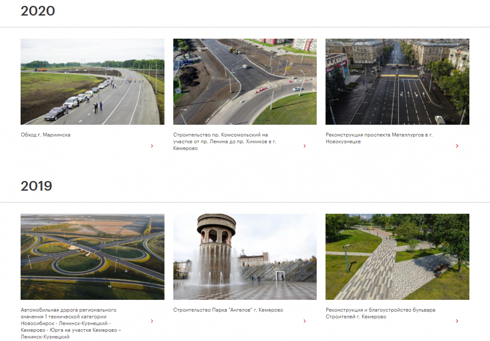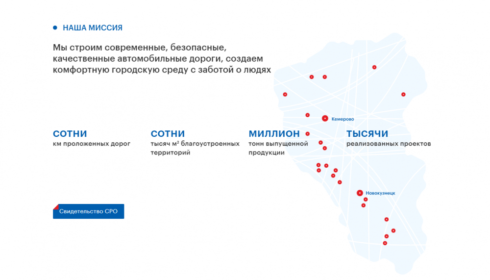Чтобы передать специфику деятельности, мы разместили фотографии реализованных объектов. Благодаря им пользователь сразу понимает, что компания занимается строительством и благоустройством. Проекты на фото показывают масштаб компании — это улицы, пространства и дороги, которыми пользуются сотни тысяч кузбассовцев ежедневно.
