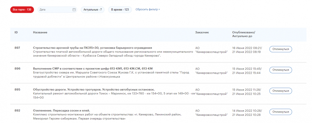 Обычно подрядчики крупных компаний специализируются на узких областях строительства. Чтобы им было проще найти работу по своему профилю, мы внедрили функцию поиска внутри реестра. Также можно фильтровать закупки по датам и актуальности.