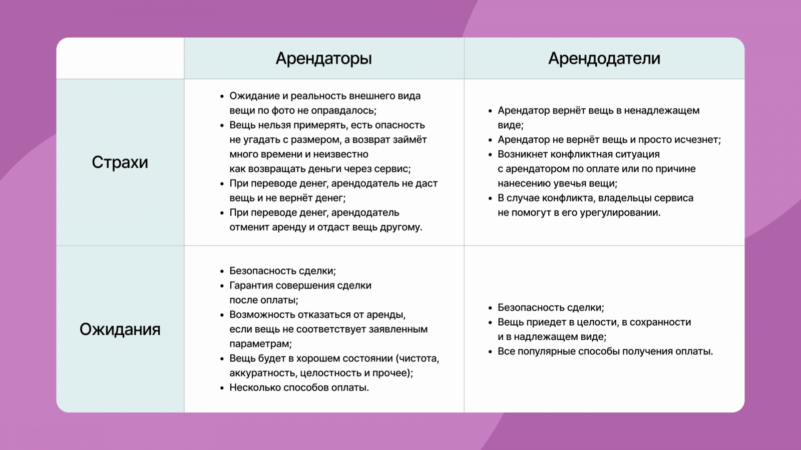 Сформировать будущую функциональность сервиса помог анализ страхов и ожиданий клиента. На основе этого исследования мы выяснили, какие инструменты будут важны для пользователей в шеринг-сервисе.