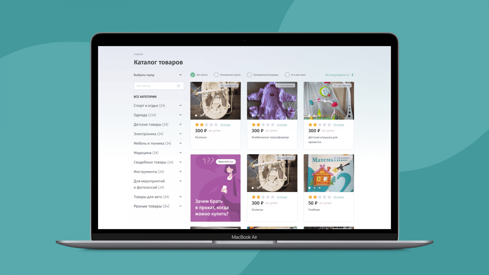 «Просто вещи» — это шеринг-сервис по аренде вещей, в котором пользователи могут сдавать или брать товары напрокат. Сервис позволяет:
