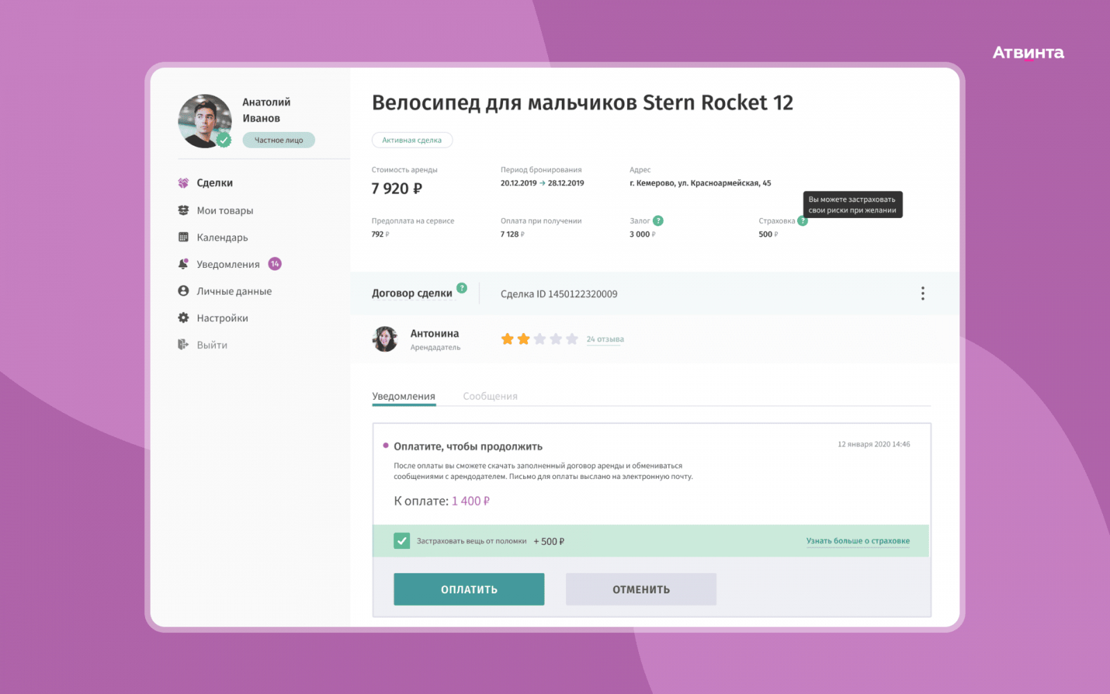 Здесь же размещен календарь, где арендатор отмечает даты, в которые он планирует пользоваться вещью. Кнопка «Арендовать» создает заявку на аренду, где отражены все условия сделки, в том числе и сумма залога при необходимости.