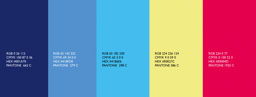 Фирменная палитра включает пять цветов: темно-синий, синий, голубой, приглушенный желто-зеленый и малиновый.