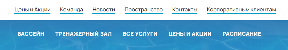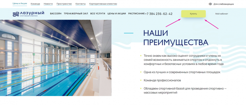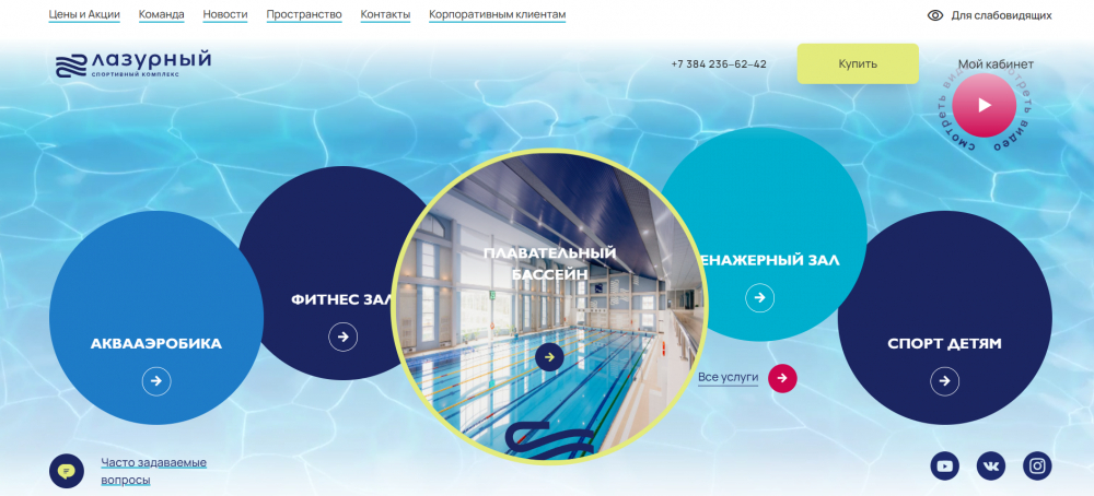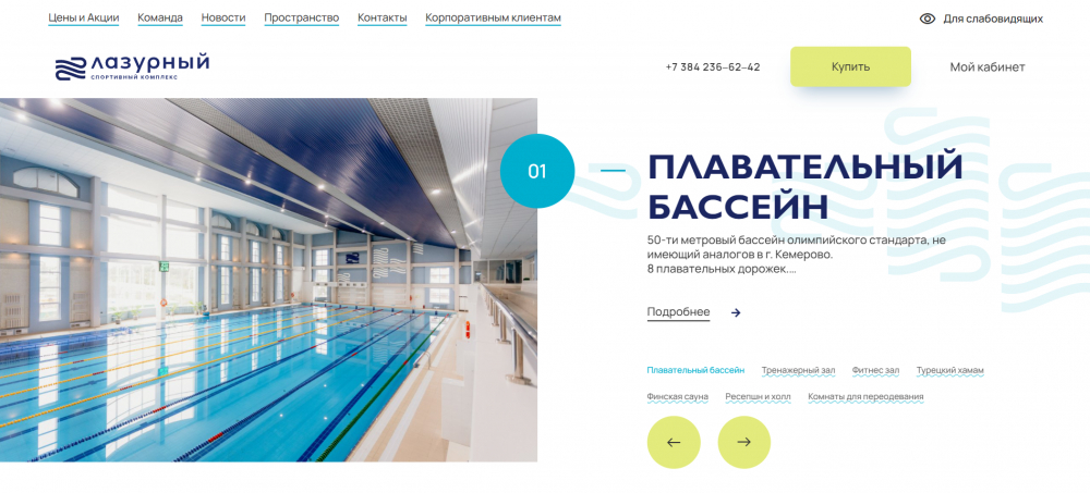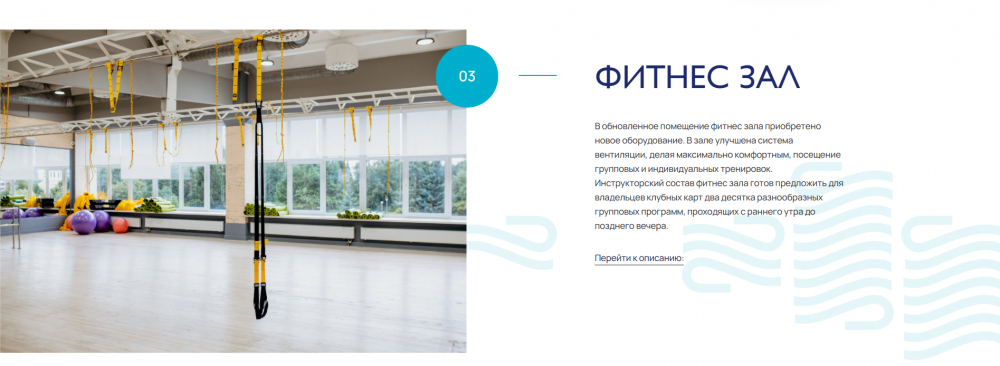 Сразу на первом экране главной страницы мы вовлекаем пользователя в изучение наиболее востребованных услуг комплекса. Так как бассейн является флагманским продуктом, мы визуально выделили его среди других направлений.