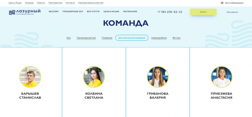 В «Лазурном» предусмотрено как свободное посещение бассейна и тренажерного зала, так и групповые и индивидуальные тренировки. Чтобы клиенты могли заочно познакомиться с тренером и выбрать преподавателя для себя или ребенка, мы разработали раздел «Команда». Фильтрация позволяет сегментировать сотрудников комплекса по нужному направлению.