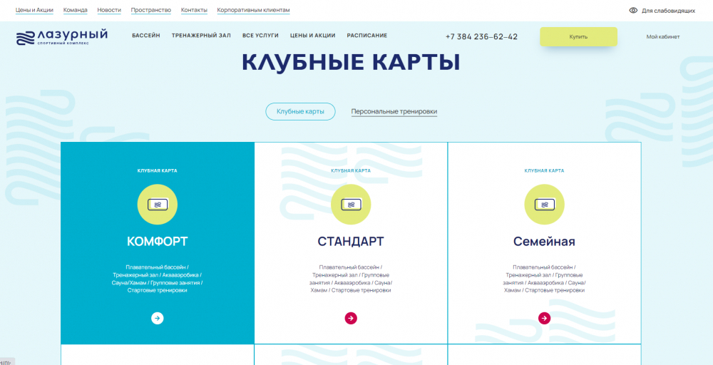 Узнать стоимость занятий и оформить клубную карту пользователь может в разделе «Цены и акции». В блоках размещены предложения с различными комбинациями услуг.
