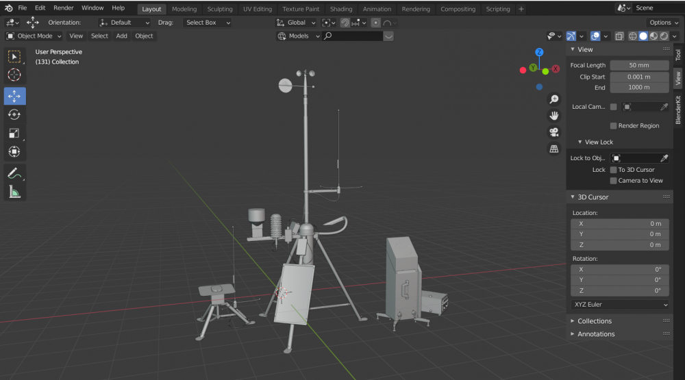 Оборудование моделировали с нуля. Для этого запросили у клиента фотографии самых ходовых позиций по каждой категории с разных ракурсов. Также для проработки глубокой детализации мы нашли реальные чертежи метеорологического оборудования в интернете. Эти материалы стали основой для моделирования.
