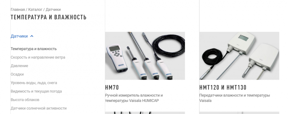В каталоге мы реализовали удобную навигацию, которая учитывает возможные сценарии пользователя. Каталог делится на 11 разделов по основным видам продукции. Где это требовалось, добавили разбивку на подгруппы по критериям. Например, в разделе датчиков: