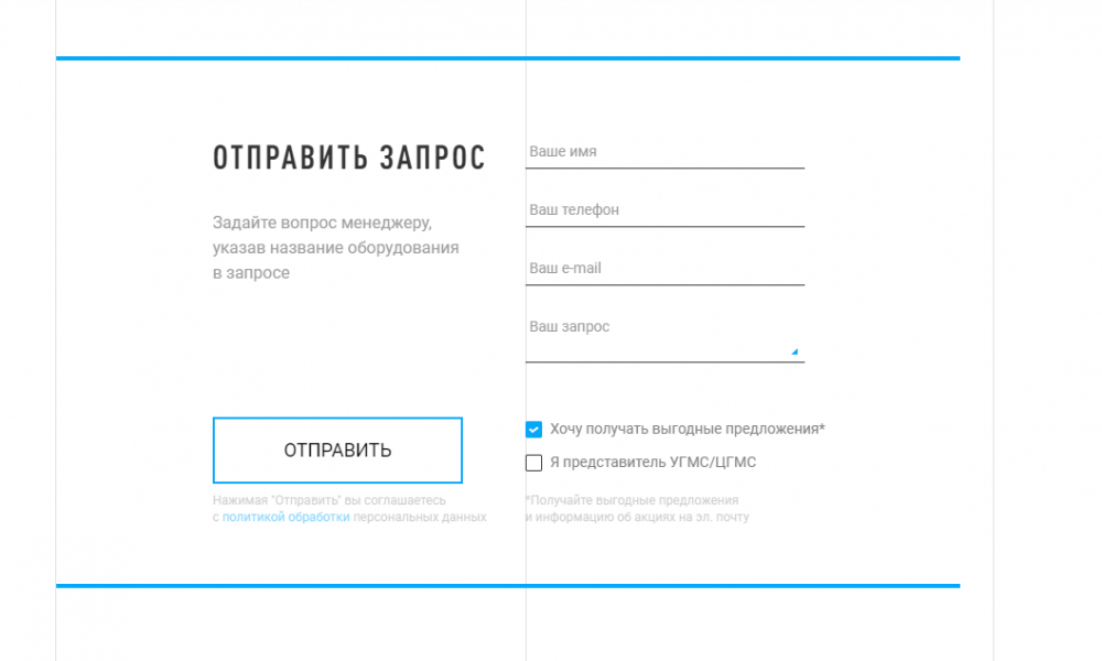 Заказы в компании оформляют через менеджера, поэтому корзина на этом сайте не нужна. Вместо этого реализовали кнопку «Отправить запрос» в карточках товара. Она перекидывает на форму заявки, с которой далее работают менеджеры. Также на оформление заявки можно перейти сразу с главной страницы, нажав на ссылку в верхней строке.