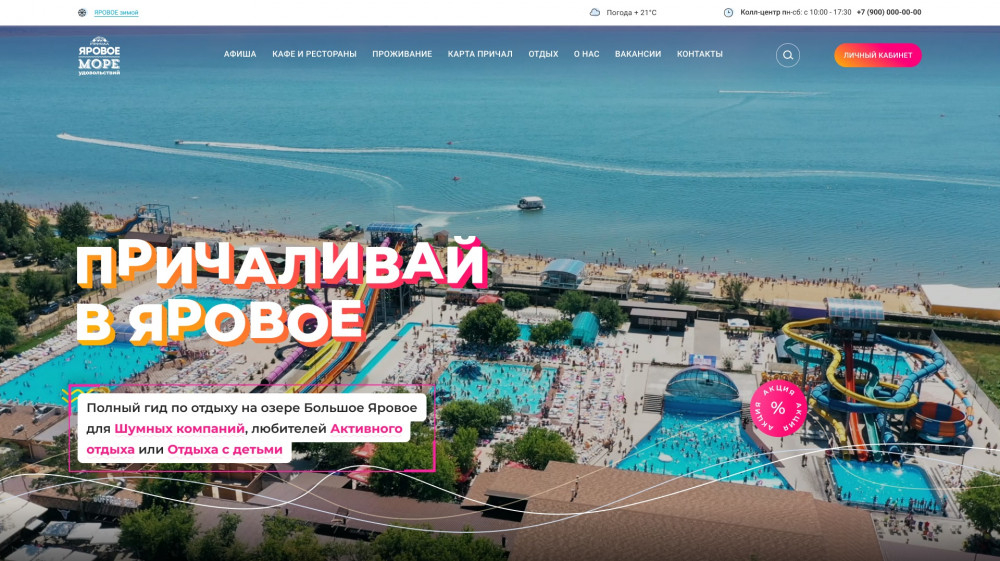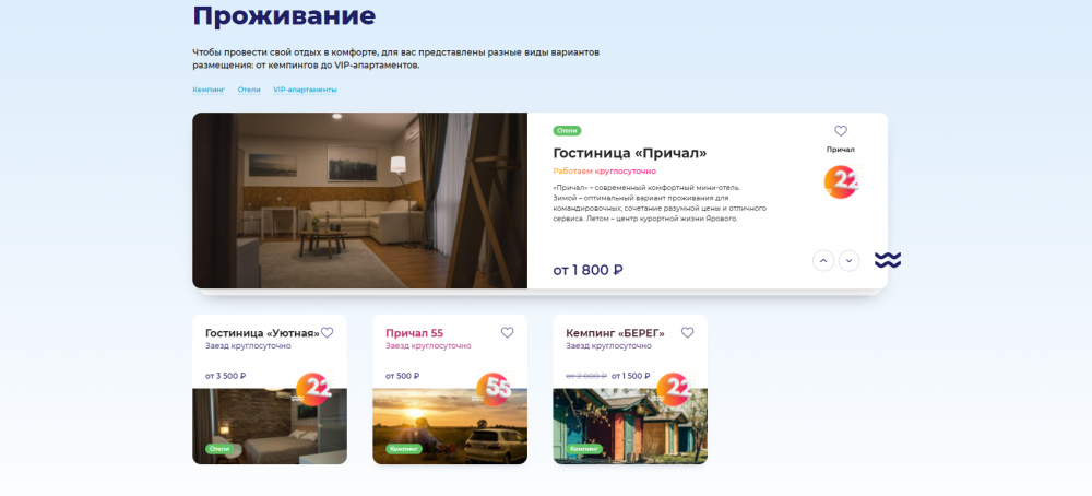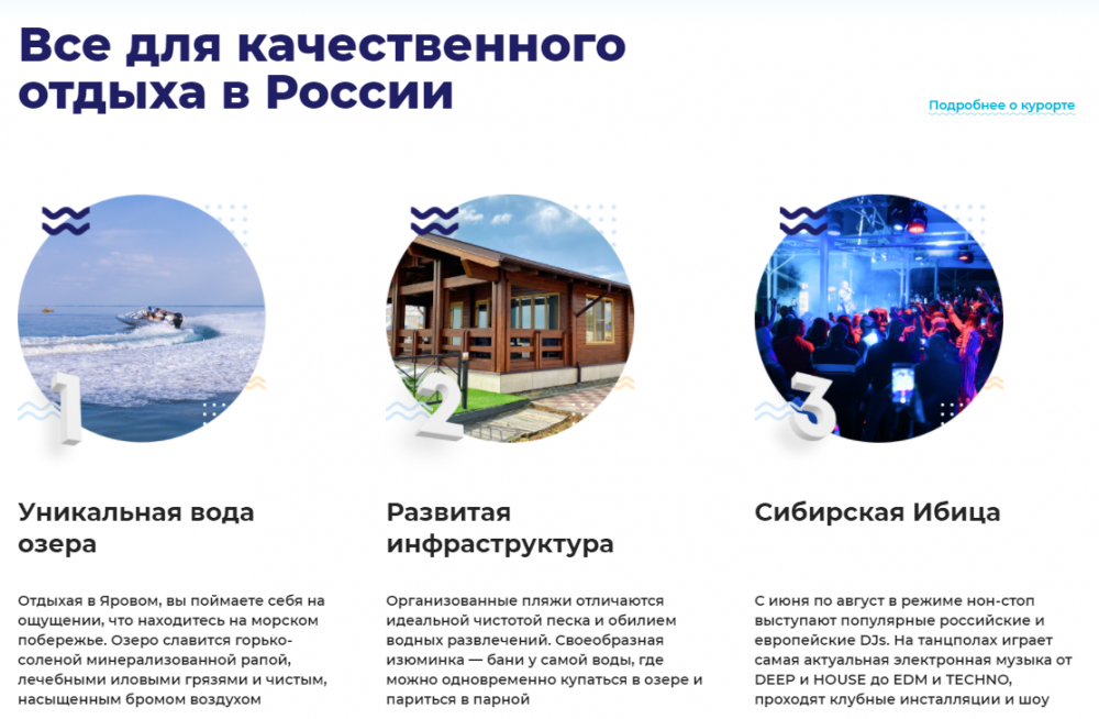 Идея сработала на пятерку — первой же страницей мы создаем вау-эффект и вовлекаем туриста в изучение сайта персонализированным контентом. Часто на курортных сайтах главная занята слоганами или баннерами с офферами, поэтому сайт «Ярового» выделяется на фоне стандартных решений.