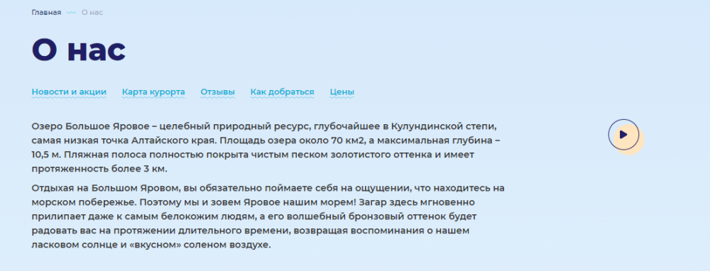 Этому посвящен блок на главной и отдельный раздел. В первом случае выделили УТП курорта, а во втором разместили более подробный рассказ и полезные ссылки на другие страницы сайта (карта курорта, как добраться).