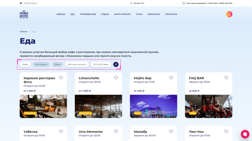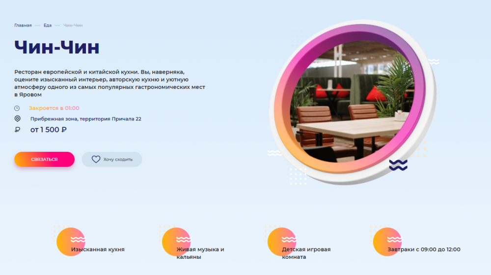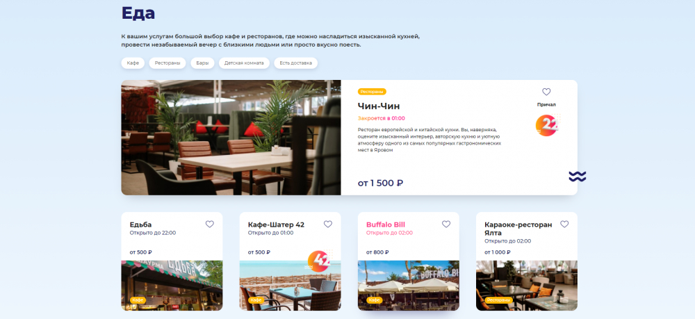 Отдельный раздел с карточками кафе и ресторанов курорта. Указаны средний чек, стиль кухни, локация, режим работы, дополнительные опции и фото заведения. Позже планируем добавить и меню с ценами.