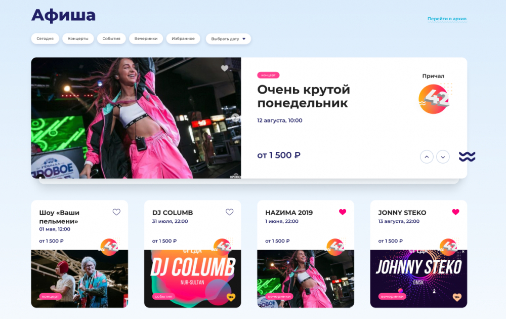 За события отвечает раздел «Афиша» с фильтрами по дате, типу ивента и удобным календарем.