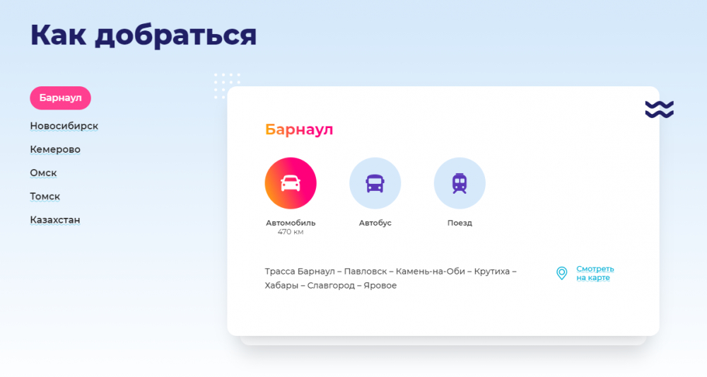 Отдельный блок на главной с маршрутами из городов, откуда чаще всего приезжают на Яровое. Расписаны виды транспорта и необходимая информация по ним.