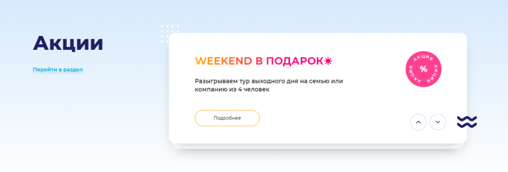 Многие туристические сайты ставят баннер с акцией прямо на первый экран главной, мы же пошли другим путем и поместили эту информацию на почетное второе место. Это сделано, чтобы освободить первый взгляд пользователя для элемента, который вовлечет его в атмосферу курорта.