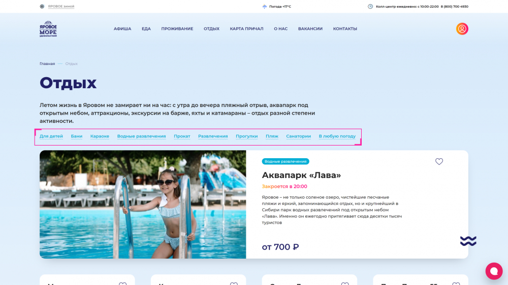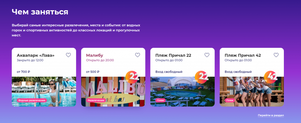 За это отвечает раздел «Отдых». Можно ознакомиться со списком всех мест или перейти в один из десяти подразделов, которые отобраны исходя из специфики курорта и анализа поисковых запросов.