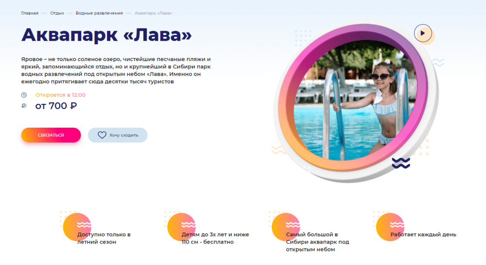 Чтобы получить дополнительный трафик и рассказать о важной точке притяжения туристов, мы сделали отдельную подробную страницу об аквапарке.