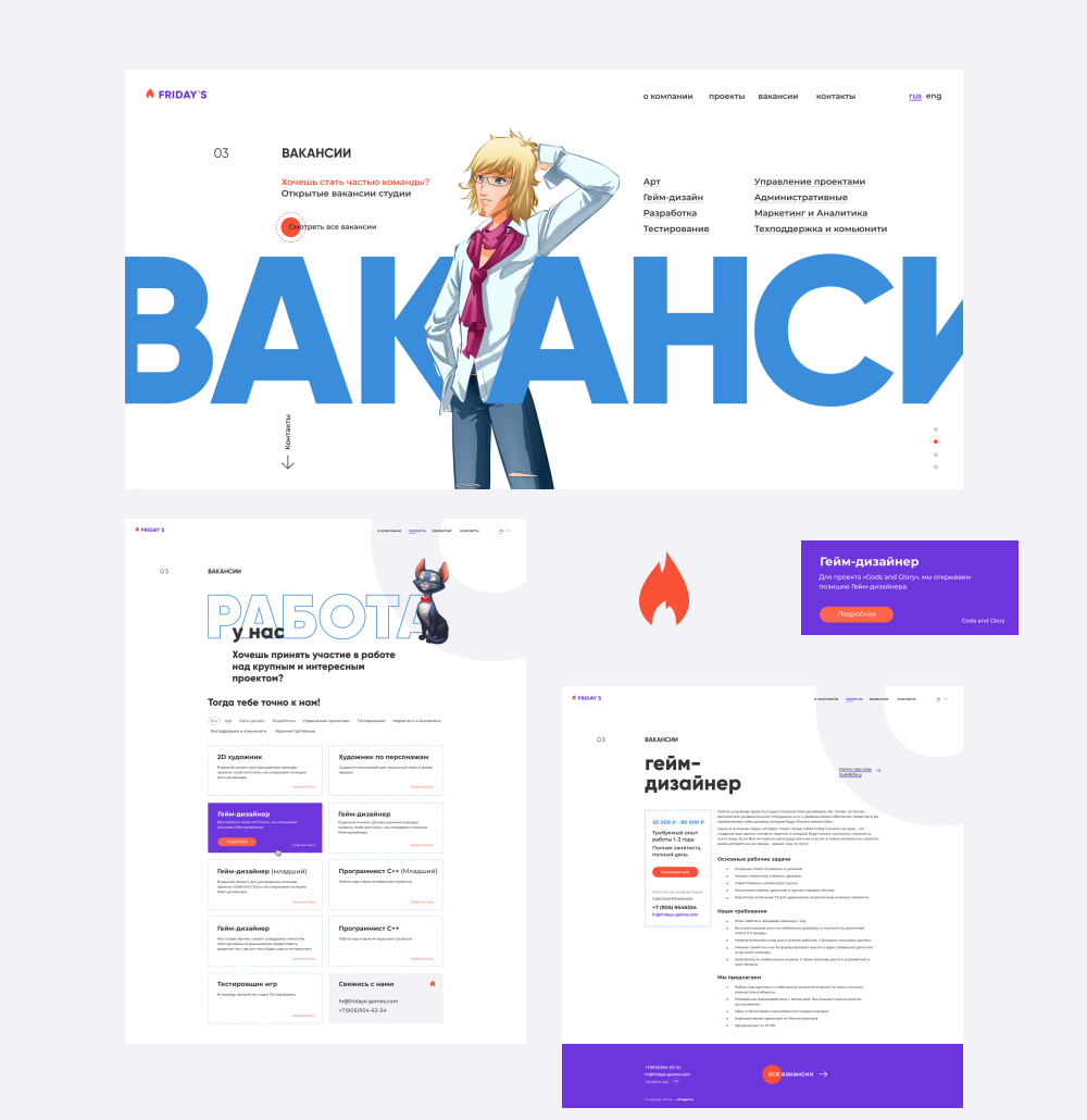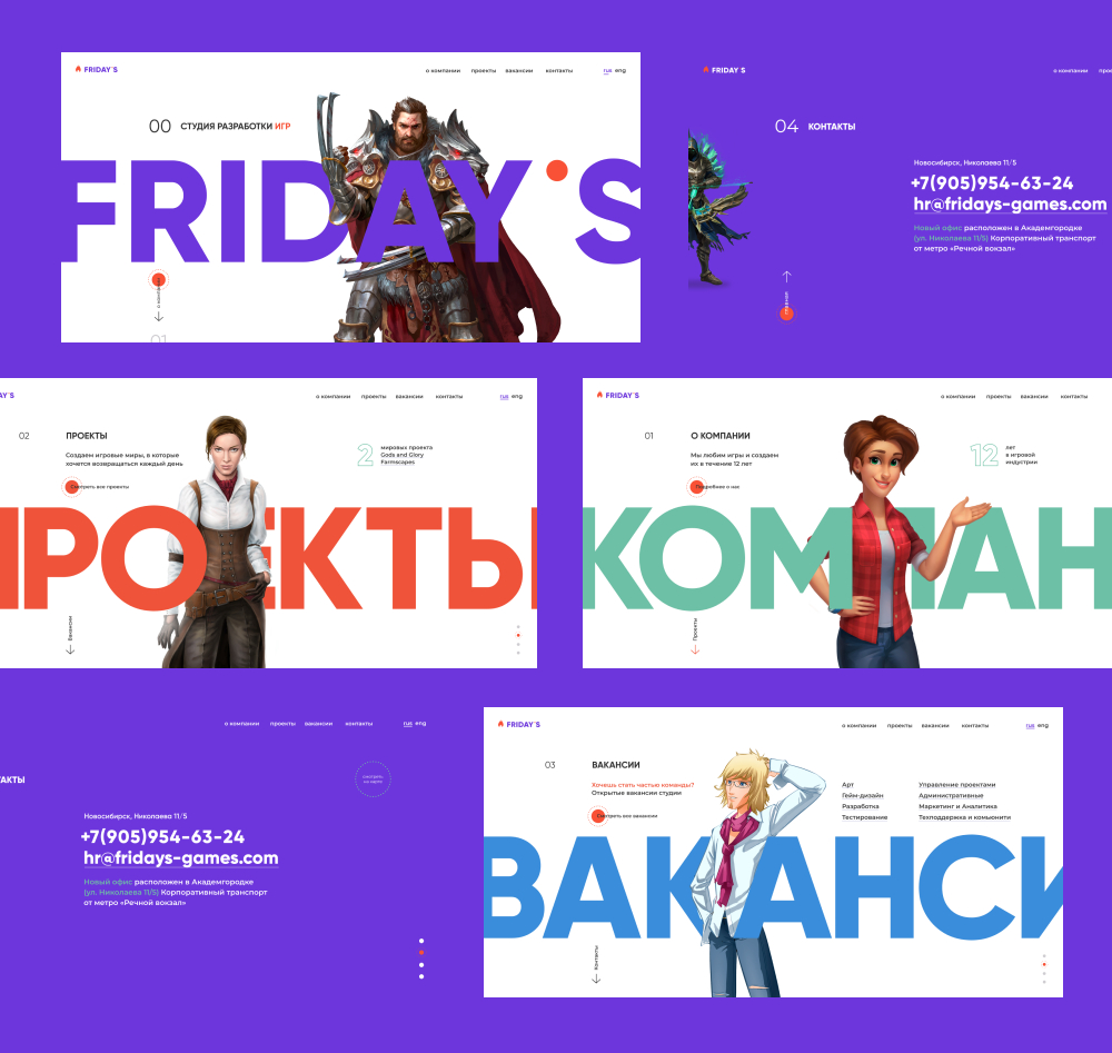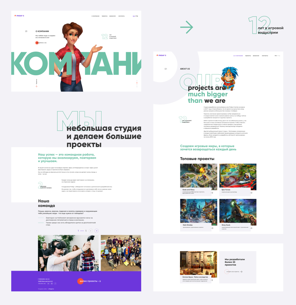 Типографику заголовка для каждого раздела дополнили персонажами из проектов Friday’s Games.