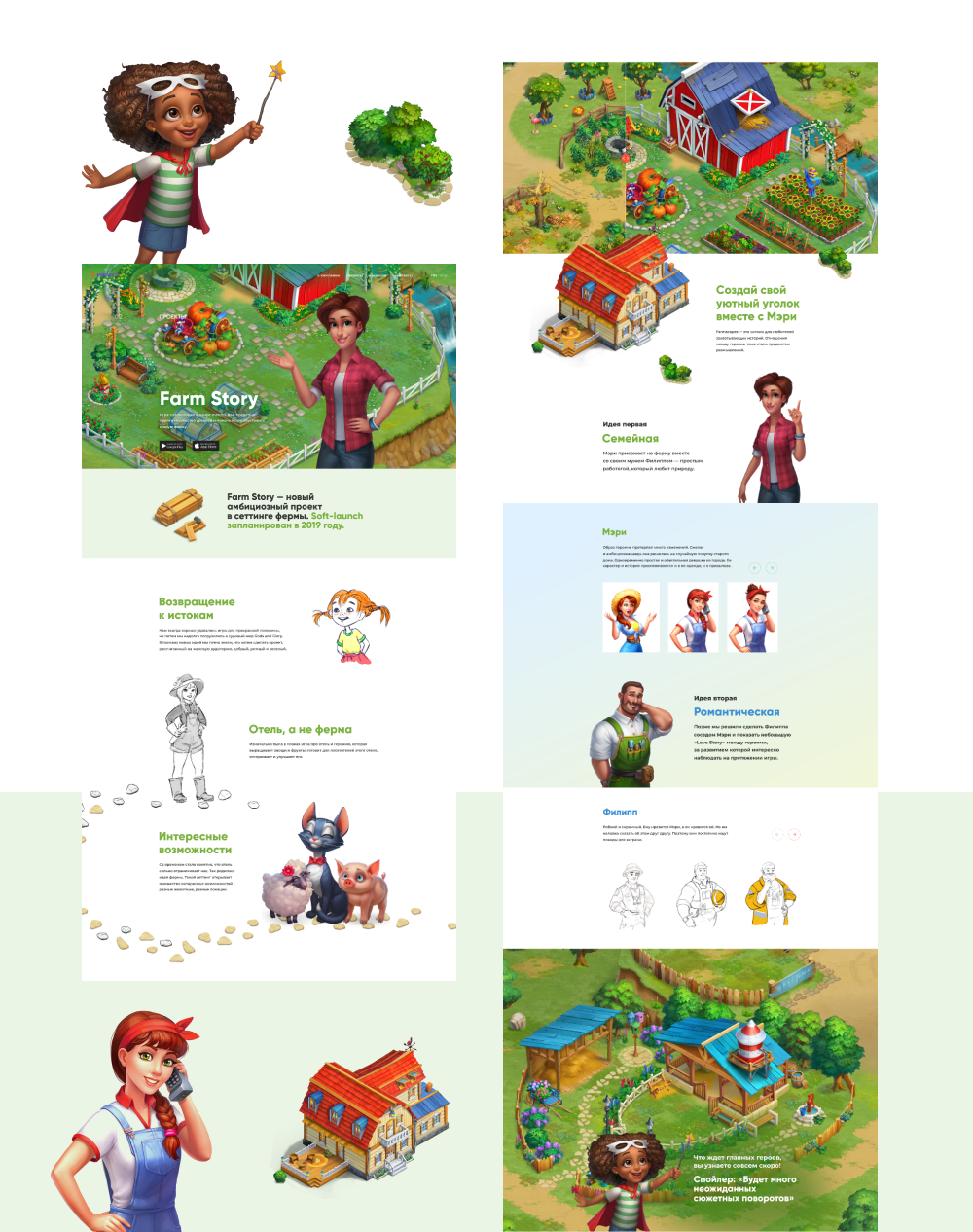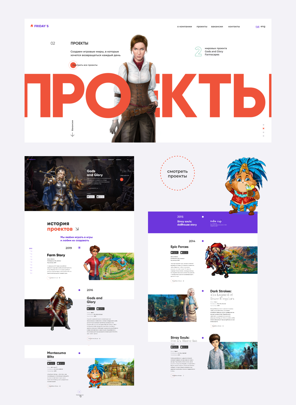 Страницы флагманских проекты сделали более масштабными. Здесь рассказываем не только общую информацию об игре, но и показываем персонажей, скетчи, историю создания. Дизайн каждой из этих страниц — уникальный и разработан с учетом той информации, которую заказчику важно было показать.