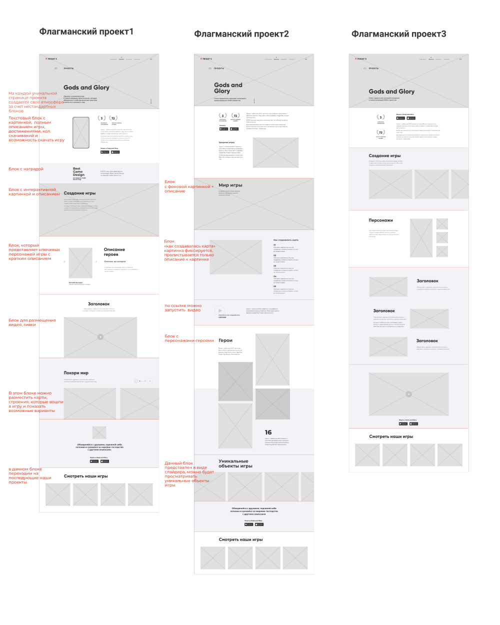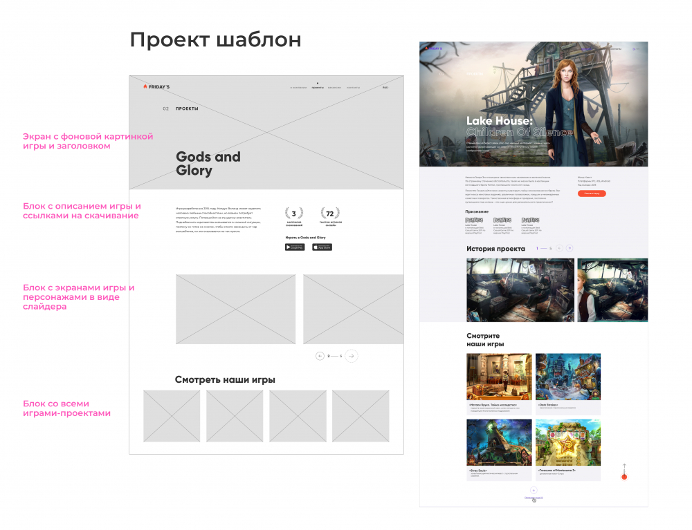 Для начала спроектировали несколько вариантов страниц с разной компоновкой информации. Такое визуальное представление помогло команде Friday’s Games сориентироваться, что они хотят рассказать о своих самых любимых проектах и какой контент передадут нам для разработки дизайна.
