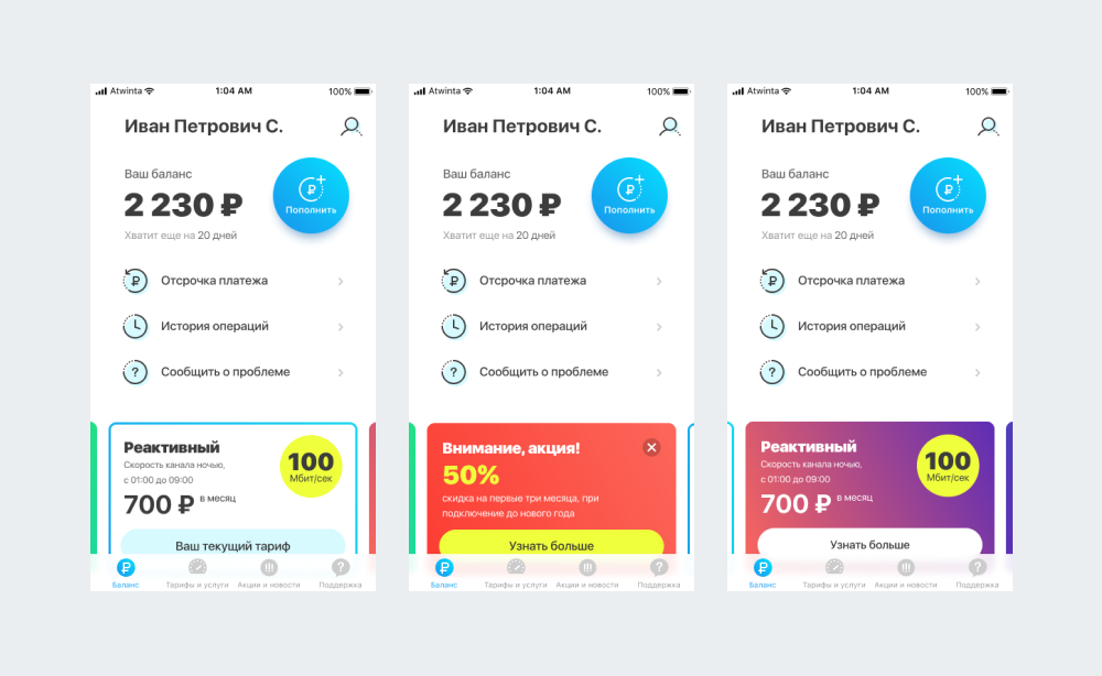 Через приложение провайдер оперативно сообщает о технических работах на линии, изменениях в тарифах или акциях. Для этого на первом экране разместили новости, информацию новых тарифах и скидках.