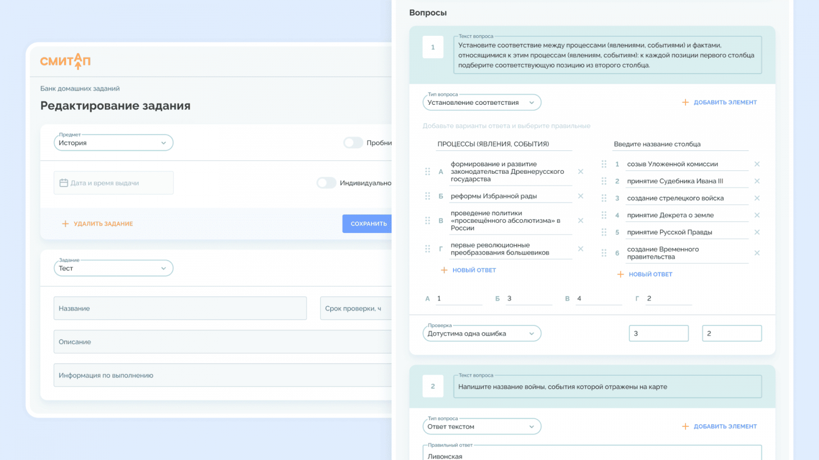 В СМИТАП редактор адаптирован под форматы ЕГЭ. Он учитывает незначительные ошибки, а тесты можно копировать и перемещать между курсами. Благодаря такому подходу изменения в одном элементе автоматически появляются во всех связанных уроках — это экономит недели работы на обновлениях.