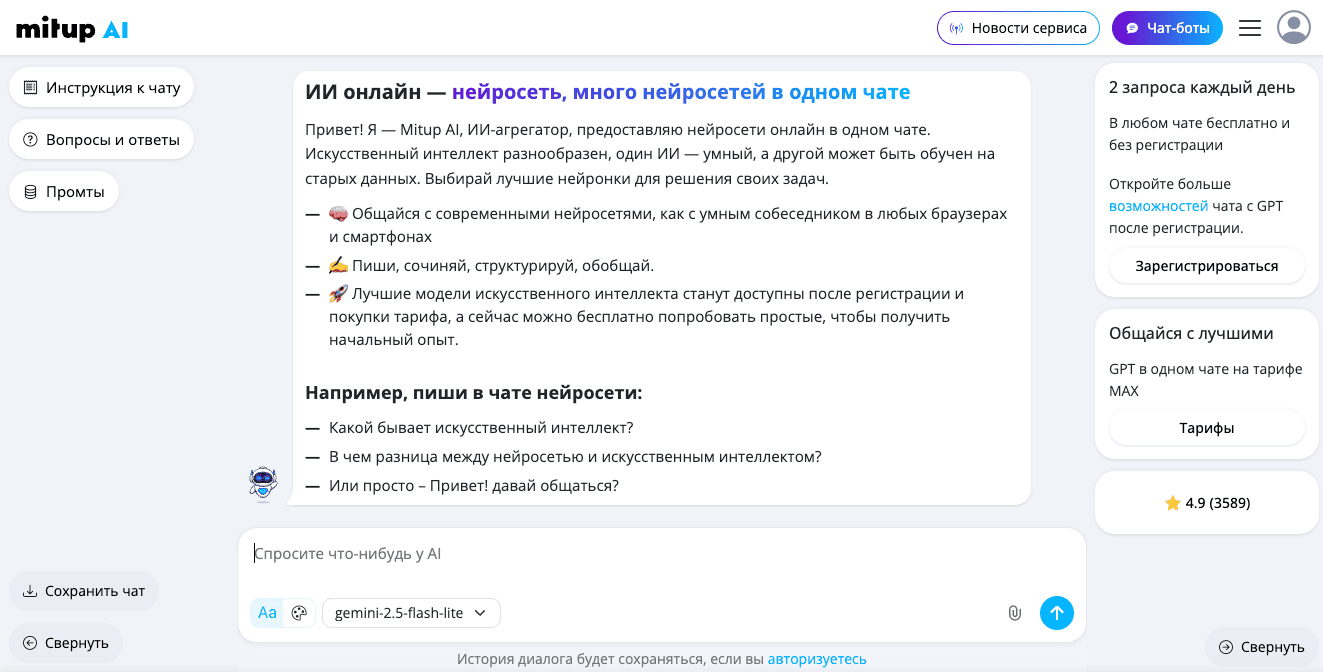 Краткий обзор: Mitup AI — понятный агрегатор для широкой аудитории, и это чувствуется с первых экранов: меньше «магии», больше логики. Для создания описаний товаров он хорош, когда вам важно быстро сориентироваться без технических деталей и лишних настроек. Отдельный плюс — наличие российских моделей, которые иногда лучше попадают в локальные формулировки и стиль общения. Но если вы ищете продвинутые ассистенты, шаблоны под конкретные маркетплейсы или глубокую кастомизацию, сервис может показаться слишком базовым: по сути, это «чат плюс каталог», без ярко выраженных уникальных инструментов.