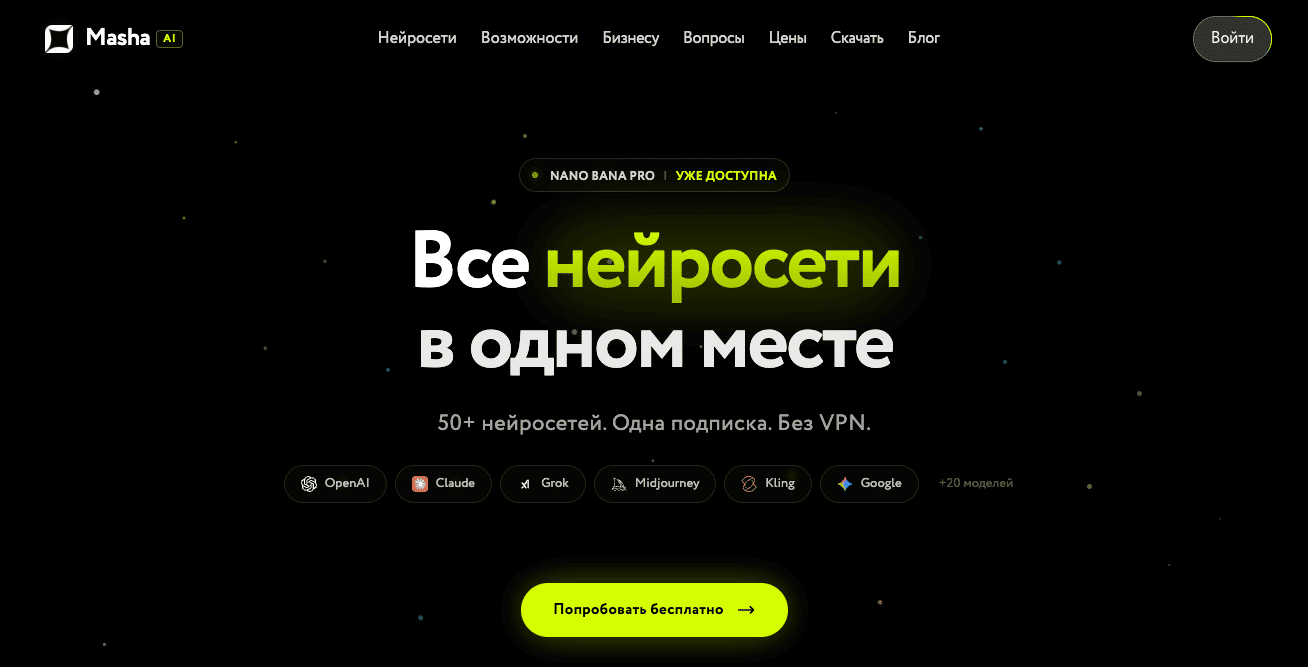 MashaGPT — это «структурированный гид», который хорошо заходит тем, кто любит порядок. Для Генерации идей это удобно: слева меню, внутри — понятные разделы по функциям, плюс отдельный креативный режим, где легче переключаться на творческие сценарии. По ощущению сервис старается быть простым и русскоязычным, без лишней терминологии. Но если вам важны самые свежие модели и широкий выбор, может не хватить глубины: набор нейросетей небольшой, а некоторые решения ощутимо дороже при сопоставимых возможностях.
