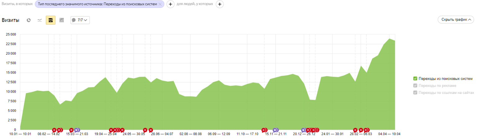 1. Количество визитов за 4 месяца выросло с 10 000 до 23 000 пользователей со всех поисковых систем.