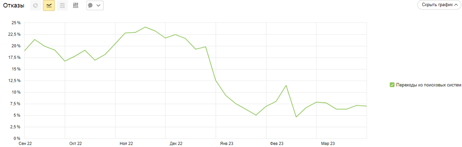 2. Количество отказов по всему сайту уменьшилось с 22,5% до 5%.