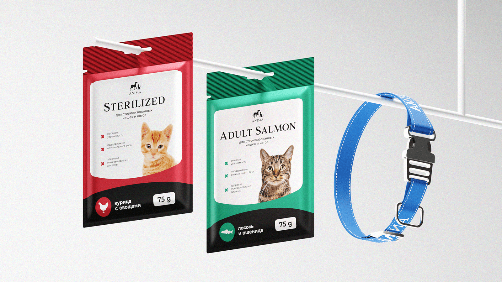 Создавая дизайн упаковки, клиент попросил разделить корма на 3 группы: для собак, для кошек и лечебные корма. Воплотить идею было несложно: так, синий цвет достался собакам, красный — котикам, а зелёный — специализированным кормам для животных с особыми потребностями.