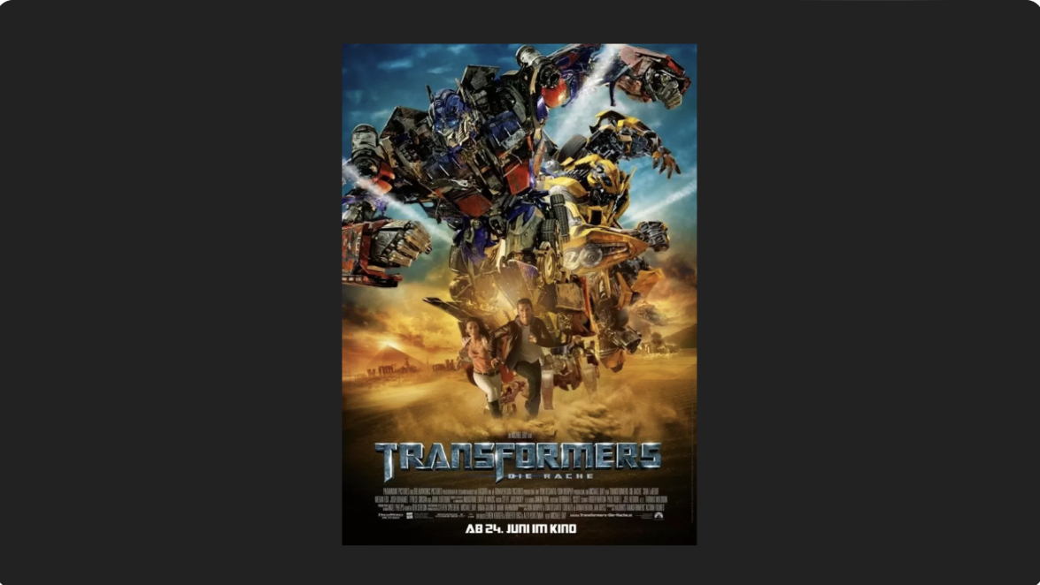 Пример: постер для фильма «Трансформеры» — классический образ, в котором сочетаются мощные машины, много героев, яркие цвета и акцент на зрелищность. Все это соответствует жанру экшн и отвечает интересам аудитории, ценящей динамичные фильмы с эффектными сценами.