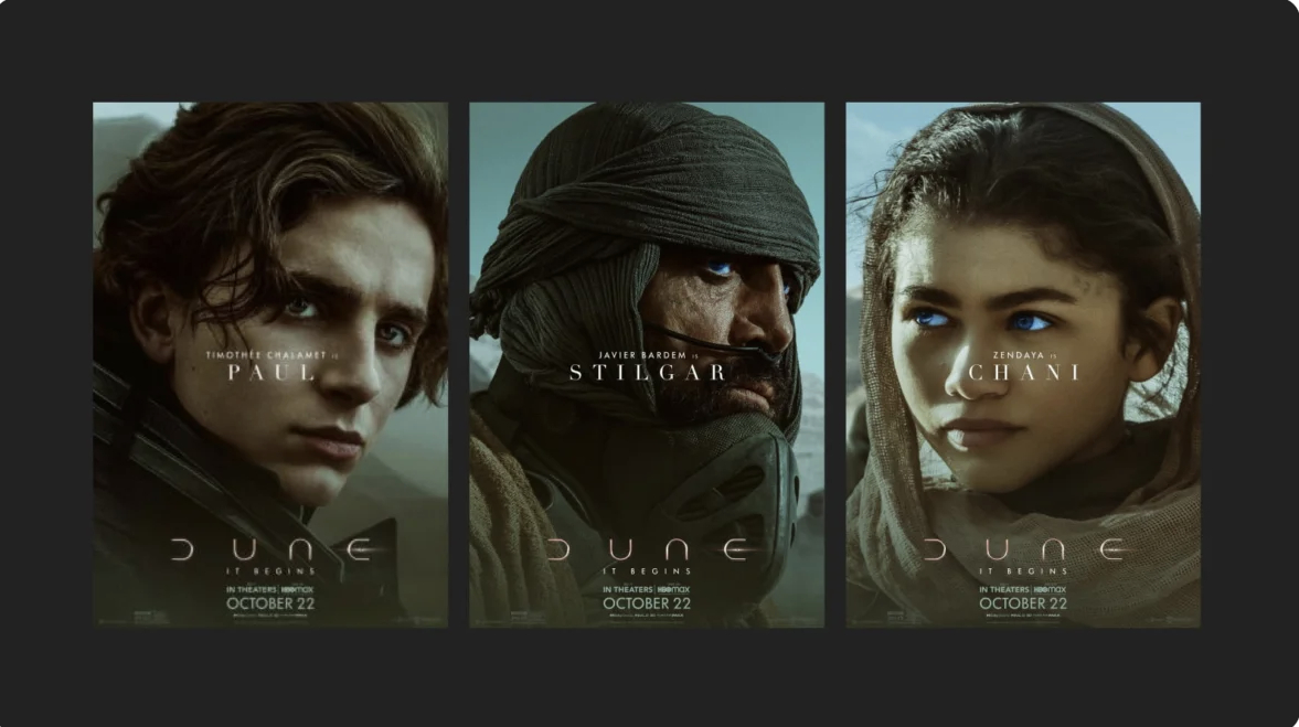«Дюна» (2021) — отличный пример того, как визуальные материалы работают в комплексе, усиливая интерес к фильму и привлекая внимание разных аудиторий.