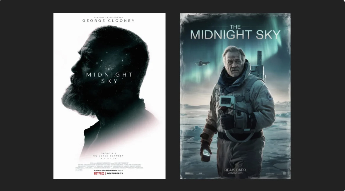 На основе анализа предпочтений зрителей в разных странах был создан постер к фильму «Полночное небо», который фокусируется на главном персонаже (Джордж Клуни) и космической угрозе. Темные, мрачные оттенки подчеркивают атмосферу постапокалипсиса. ИИ предложил несколько вариантов дизайна, которые затем прошли тестирование на фокус-группах.
