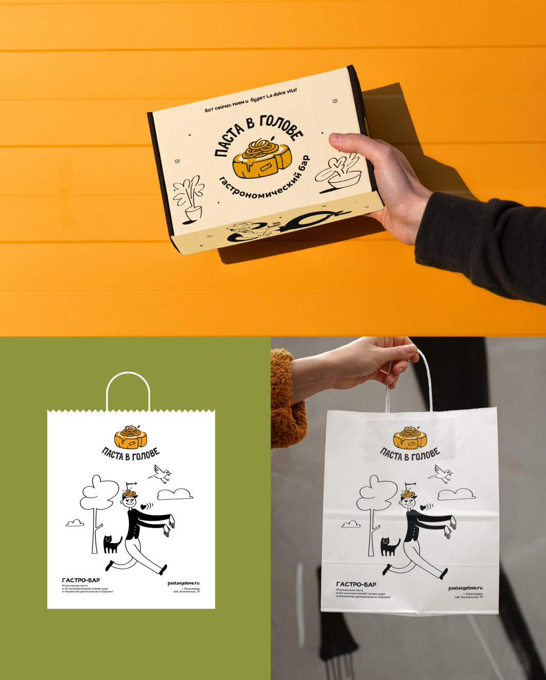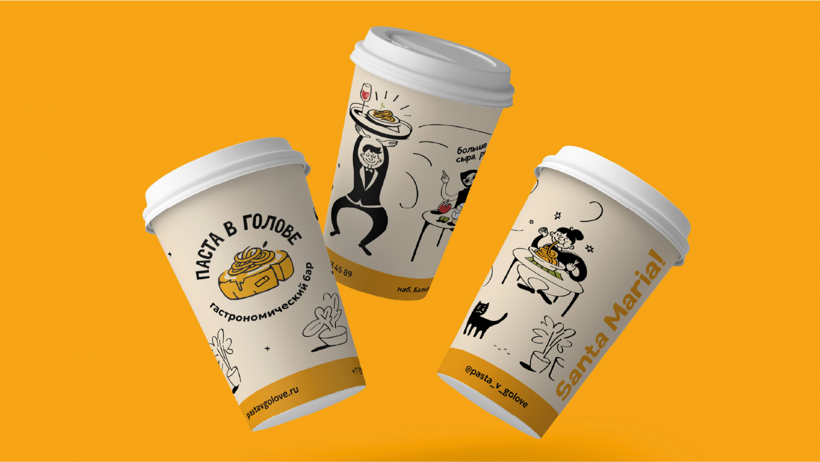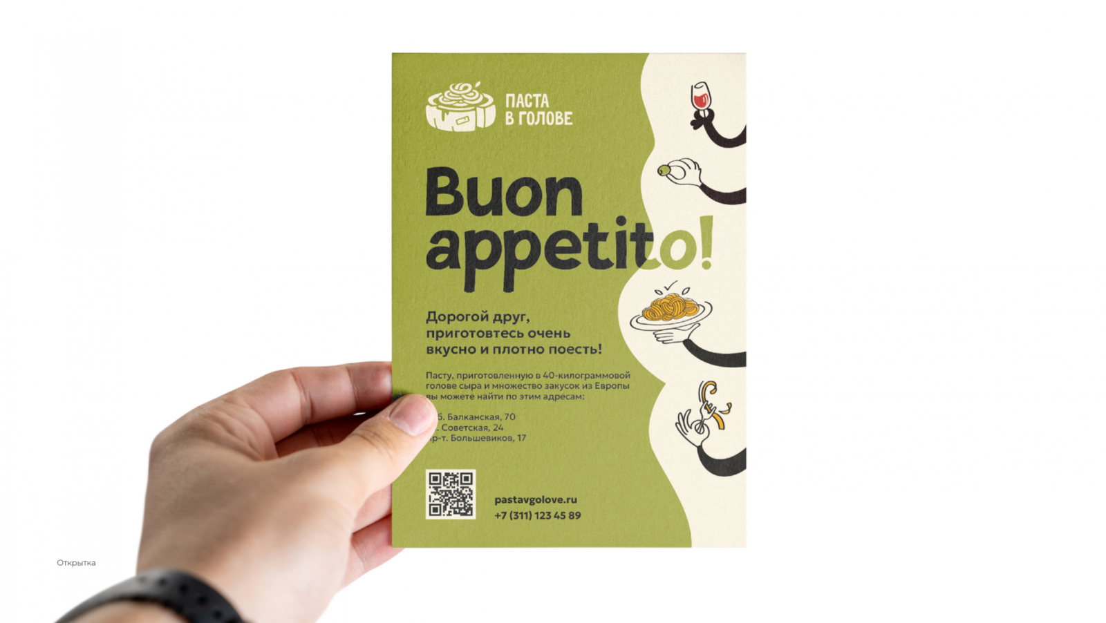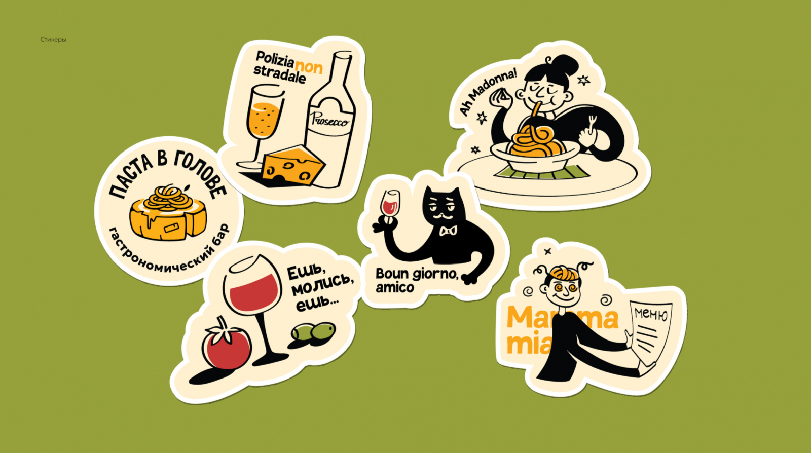 Визуальный знак отсылает к моменту, ради которого приходят гости: горячая паста готовится в сырной голове. Этот образ стал визуальным символом бренда. Мы собрали его в иллюстративный логотип — с пластичной графикой, узнаваемой динамикой и визуальной цельностью.
