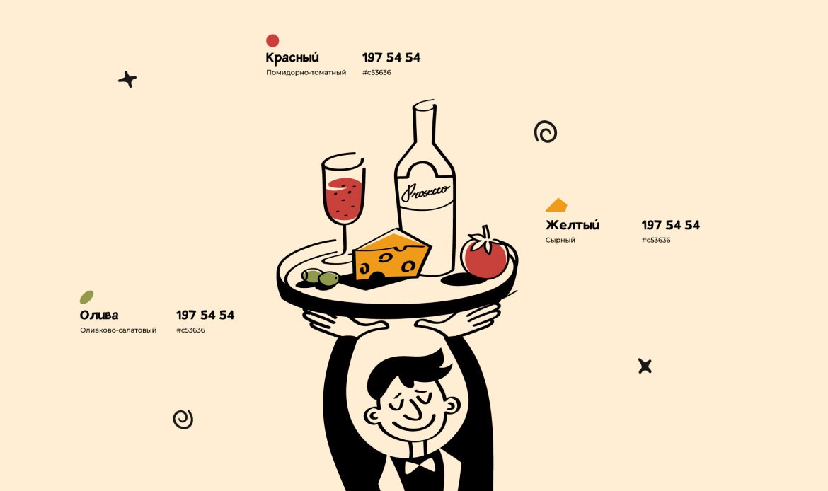 Палитра строится на оттенках, которые напрямую отсылают к еде и атмосфере: желтый — сырный, красный — томатный, оливковый, а для фона — кремовый, как нежный сливочный соус.