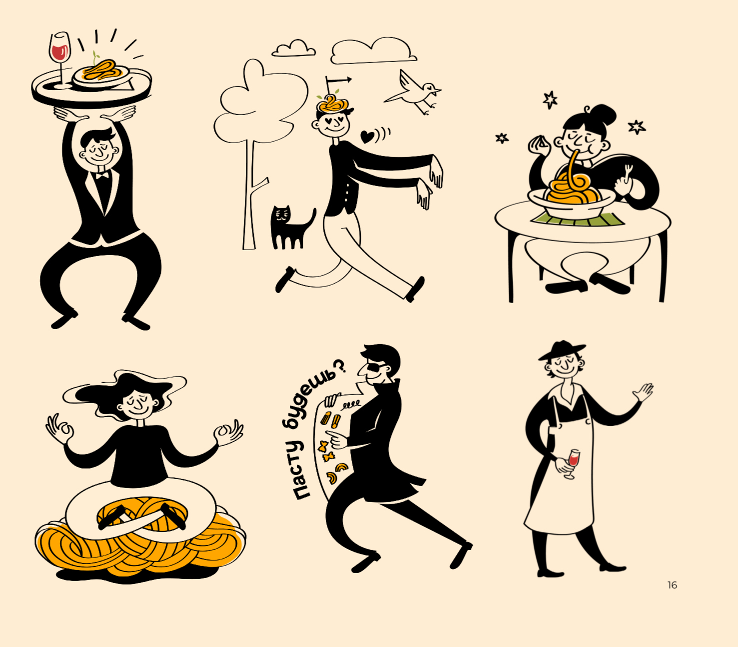 Мы добавили современные иллюстрации в стиле дудл — это наивная, но выразительная графика с персонажами, которые живут в моменте: радуются, пробуют пасту, делятся эмоциями.