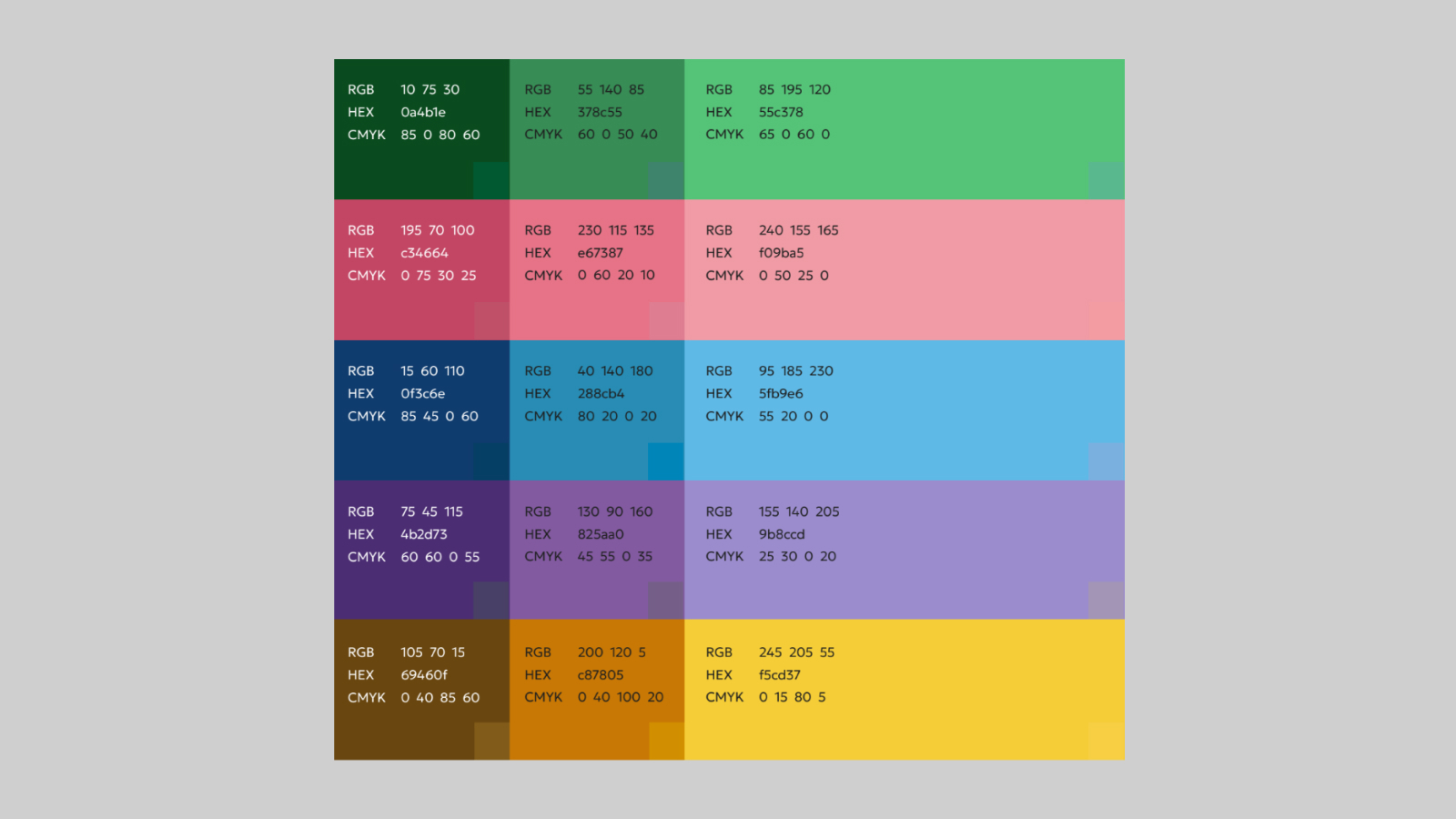 В основу современной палитры лег яркий насыщенный зелёный цвет, ассоциирующийся с природой. Гармоничное сочетание нескольких ярких оттенков подчёркивает самоидентификацию бренда и помогает создавать различные направления внутри визуальной системы и выстраивать иерархию через контрасты.