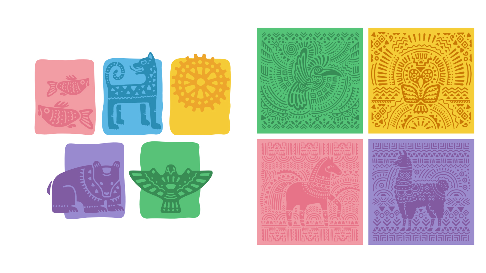 Мы использовали этот пласт искусства в современном ключе — превращая древние мотивы в яркие, динамичные композиции. Перенесли силуэты, главные образы и орнаменты в современные графические изображения в минималистичном стиле, составили цельные ритмичные композиции и использовали однотонные цвета для паттернов.