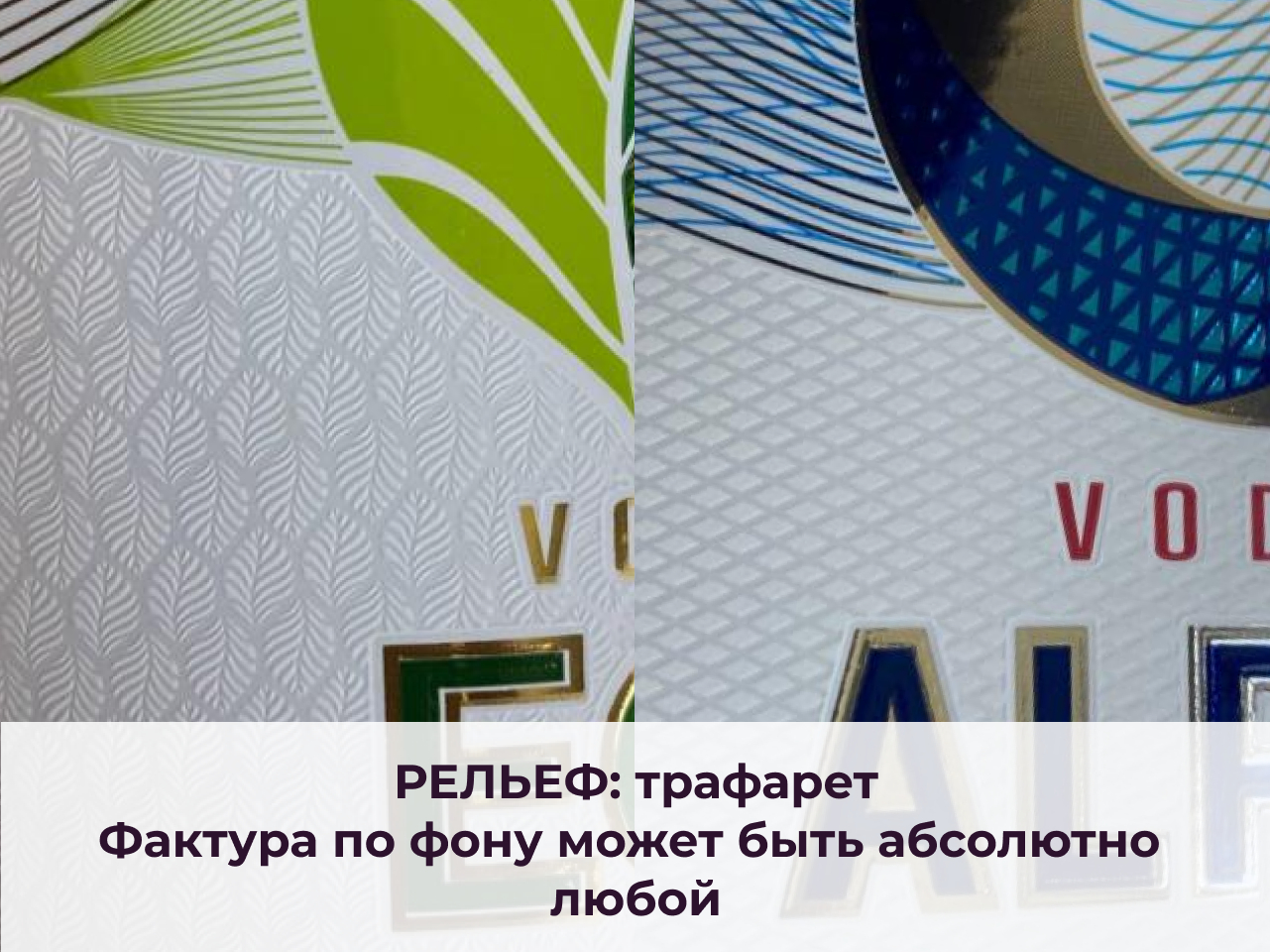 Рельеф позволяет вводить в композицию дополнительный слой информации — от микроорнамента до крупной текстуры. Можно сымитировать любую нужную фактуру, если нет желания или возможности использовать настоящий материал: металл, дерево, кожа. Технология адаптируется под возможности оборудования и бюджета. Фон может быть любым: геометрическим, тематическим, декоративным. На практике рельеф добавляет глубину, «пружинит» свет и подчеркивает логотип или элементы.