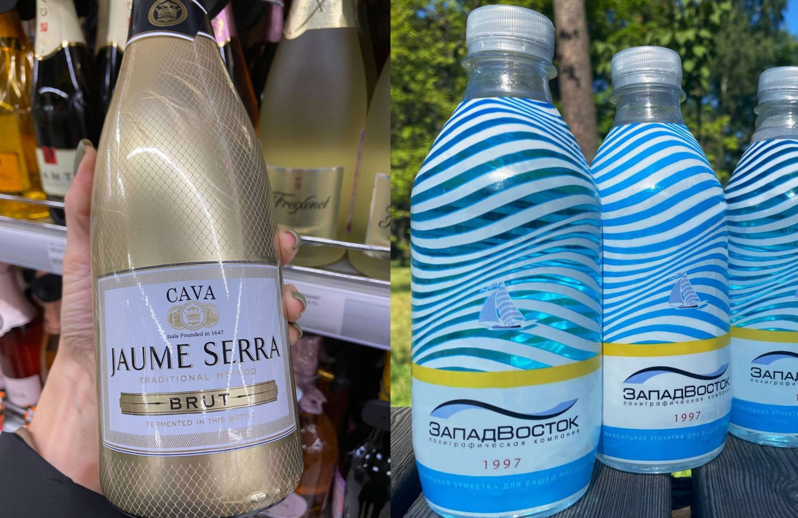 - Полное покрытие. Можно задействовать всю поверхность тары — от горлышка до основания. Это даёт простор для креатива и помогает выделиться на полке.