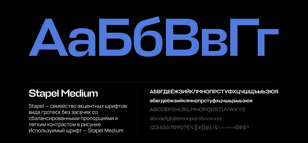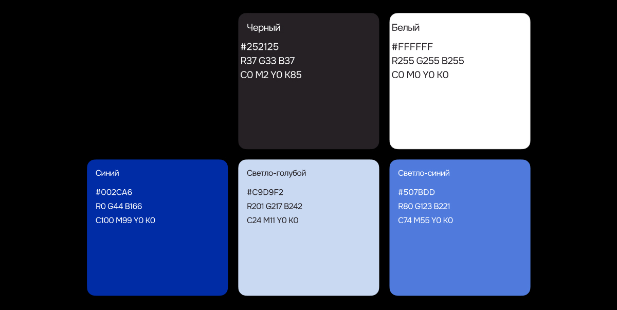 Для второстепенных визуальных идентификаторов мы подобрали светло-синий и светло-голубой цвета. Черный и белый — для работы с текстом на разных фонах