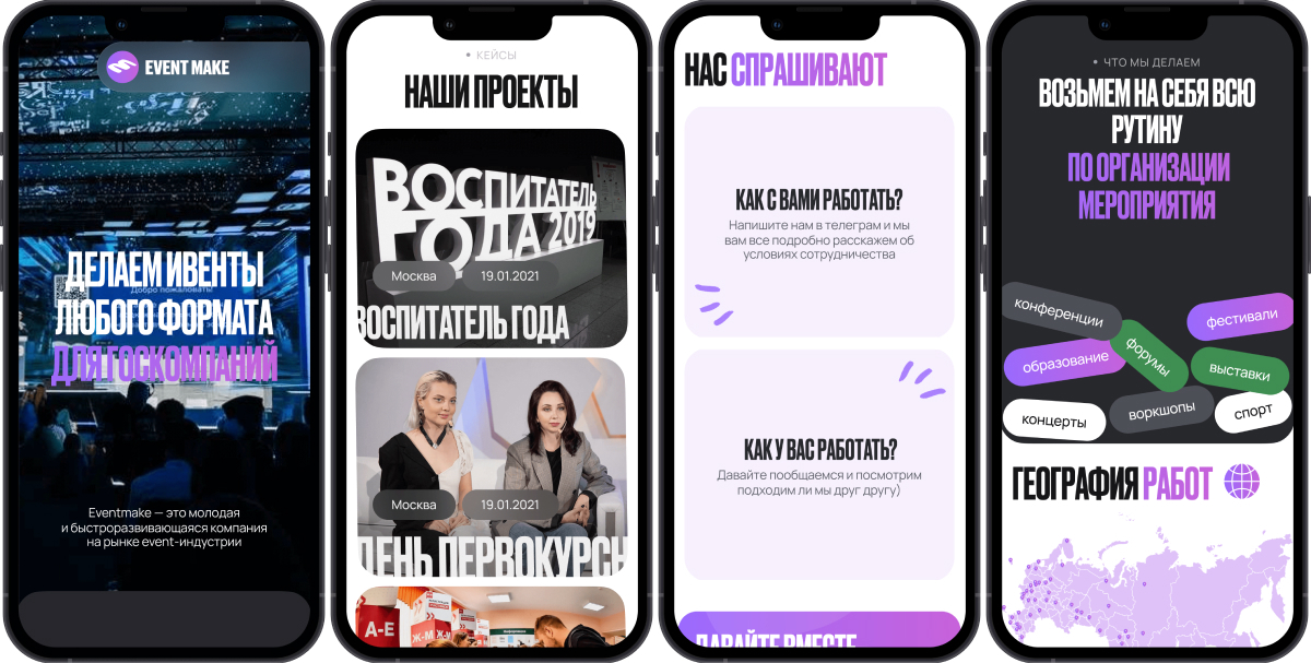 - Анимированный список кейсов в формате: фото анонс; название мероприятия; город; дата.