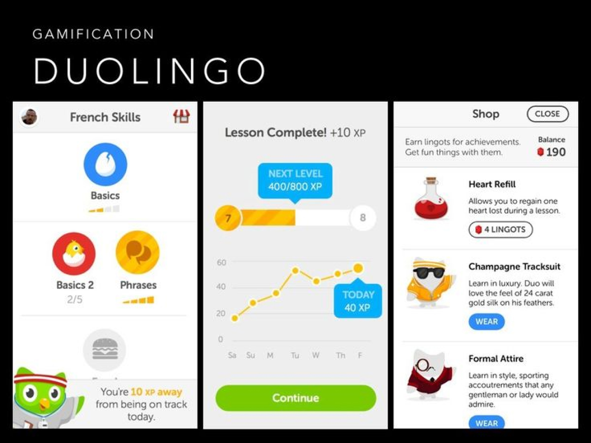 - Duolingo — один из лучших примеров успешной геймификации. Их система уровней, наград, виртуальной валюты (лингов) и ежедневных челленджей удерживает пользователей в приложении и мотивирует к обучению.