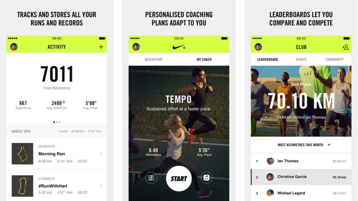 - Nike+ Run Club — приложение, которое использует соревнования, бейджи и челленджи, чтобы мотивировать пользователей тренироваться. В нем есть рейтинги, совместные забеги и персонализированные награды.