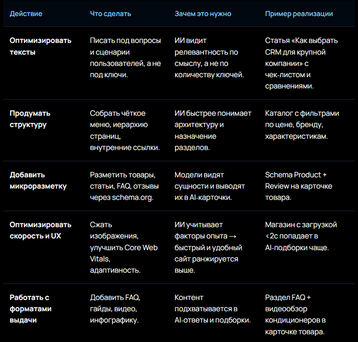 ИИ смотрит на сайт как эксперт, которому важно всё: содержание, структура, удобство и техническая «чистота». Если упор делать только на тексты, без разметки и UX, то ваш сайт рискует остаться «невидимым» для новой поисковой реальности.