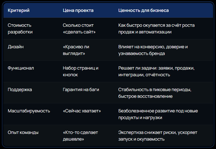 Цена — это то, что мы видим в смете. Ценность — то, что почувствует бизнес после запуска.