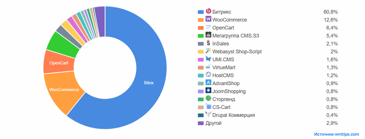 Среди движков интернет-магазинов по сайтам из РФ 1С-Битрикс удерживает лидерство с ~60,8% доли (12 мес., обновлено 28.08.2025). Далее — WooCommerce (12,6%), OpenCart (6,4%).(Источник: wmtips.com)
