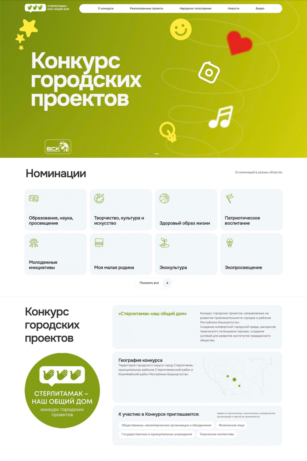 Сверху размещен яркий баннер с названием и миссией конкурса. Под ним представлены номинации с иконками и краткими описаниями, помогающими быстро выбрать интересующий раздел.